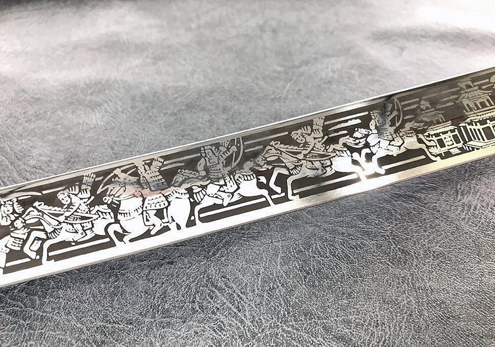 Клинок – нержавеющая сталь 440C (47–51 HRC), зеркало-полировка. С обеих сторон нанесён детальный травлёный фриз: процессия воинов, конница, пагоды и городские ворота. Рисунок контрастный, читается при любом освещении.