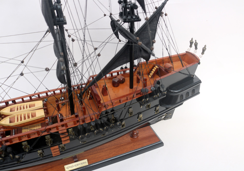 Сильная сторона этой модели — богатая фактура: аккуратно выполненные борта с пушечными портами, элементы рангоута и мачт, множество натянутых снастей, декоративные вставки на корме. На палубе видны шлюпки, леерные ограждения, небольшие надстройки и детали оснастки, а у носа — якорь и выносной бушприт, подчёркивающий динамику и «хищный» характер корабля. Чёрные паруса добавляют драматичности и делают композицию максимально кинематографичной. Завершает образ пиратский флаг с черепом — финальный штрих для коллекционного настроения.