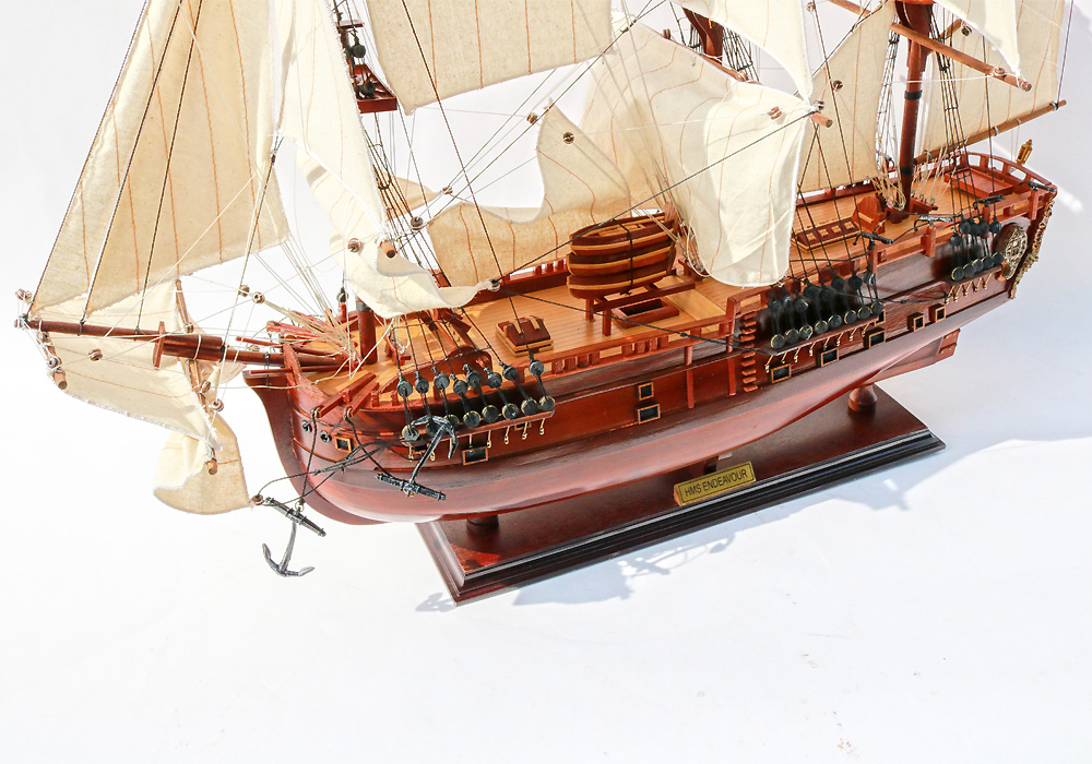На подставке — именная табличка HMS ENDEAVOUR, а на корме читается надпись ENDEAVOUR — приятный штрих, который сразу фиксирует историческую принадлежность модели.