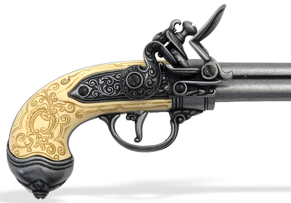 На рукоятке голова орла. Французский кремневый двуствольный пистоль с вращающимся стволом, модель 18..
