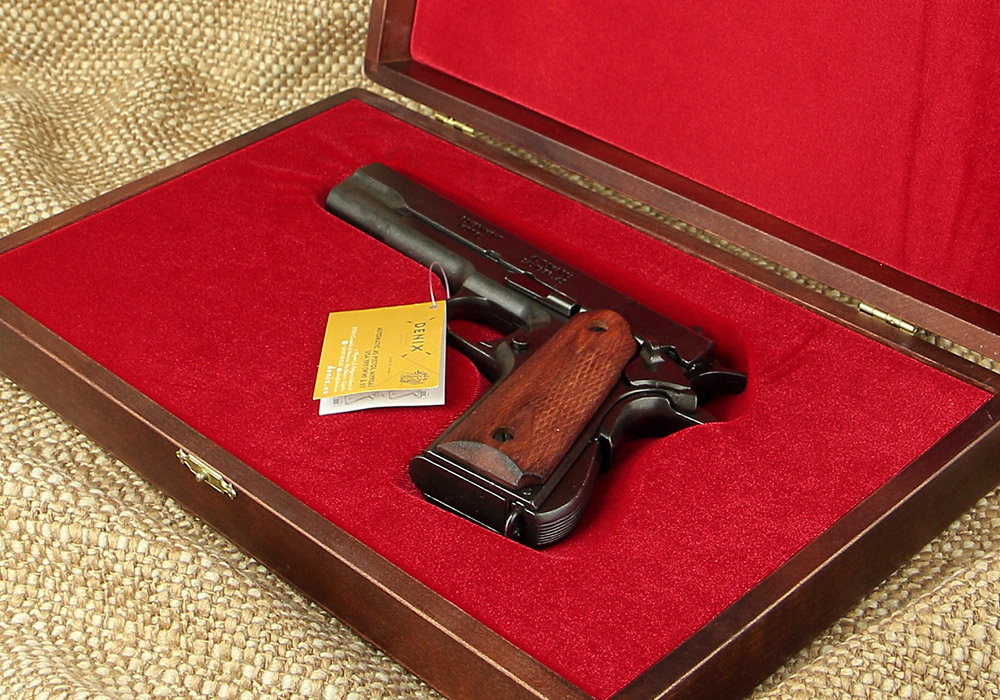 Размер и вместимость. Внутренние пропорции коробки рассчитаны под пистолет формата Colt 1911 и его аналоги схожих габаритов. Размер: 6,5 × 35 × 22 см, вес 1,3 кг. Коробка достаточно плоская, чтобы лежать на полке, и достаточно основательная, чтобы стоять вертикально как экспонат. На фото видно, что в ней одинаково выигрышно смотрятся и воронёный чёрный пистолет, и позолоченный коллекционный — красный бархат работает с любым цветом оружия.